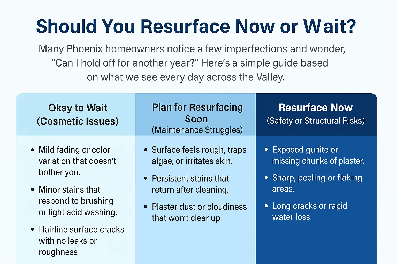 At Valley Pool Remodel, we’ve helped homeowners across the Valley restore their pools for more than 20 years. If you’re unsure whether your pool is just showing its age or truly needs resurfacing, here’s what to look for—and when to take action.